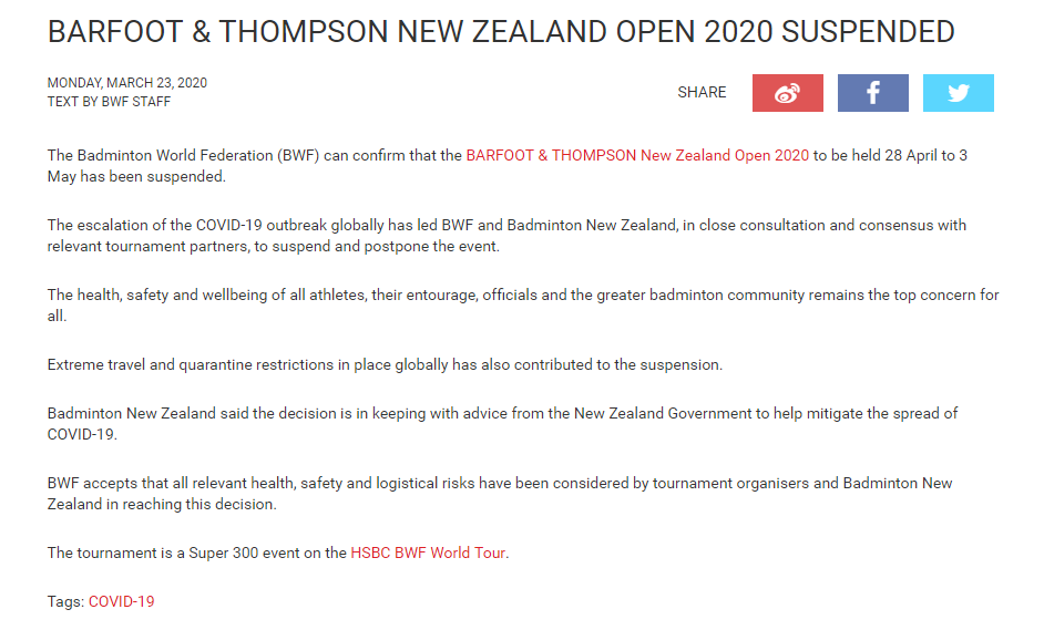 世界羽聯宣布暫停新西蘭公開賽 6月前將沒有比賽 人民網北京3月24日電(趙欣悅)北京時間3月23日,世界羽聯在官網宣布,因新冠肺炎疫情原因,將暫停原計劃於4月28日-5月3日舉行的新西蘭公開賽。世界羽聯表示,鑒於全球范圍疫情升級,世界羽聯同新西蘭羽毛球協會以及相關比賽伙伴密切協商后,達成推遲比賽的共識。…