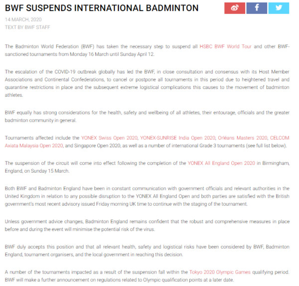 世界羽聯取消4月12日前全部比賽 奧運積分賽新規稍晚公布 人民網北京3月14日電(趙欣悅) 北京時間3月14日,世界羽聯發布公告,宣布暫停或推遲3月16日至4月12日的全部國際比賽。 世界羽聯表示,由於新冠肺炎疫情在全球范圍內的升級,考慮到所有運動員、隨行人員以及官員的健康和安全,考慮到旅行和檢疫等方面的限制,最終做出這個決定。…