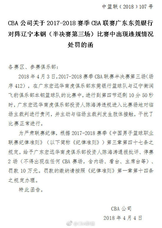 人民网北京4月4日电(杨磊) 4月4日上午,CBA公司对广东宏远男篮开出罚单,球队投资人陈海涛被通报批评,罚款10万元,2场比赛不得进入任何CBA赛场。 在昨晚进行的CBA联赛广东男篮对阵辽宁男篮的比赛中,比赛第四节还剩10分50秒时,广东宏远男篮投资人陈海涛因对判罚不满,在…