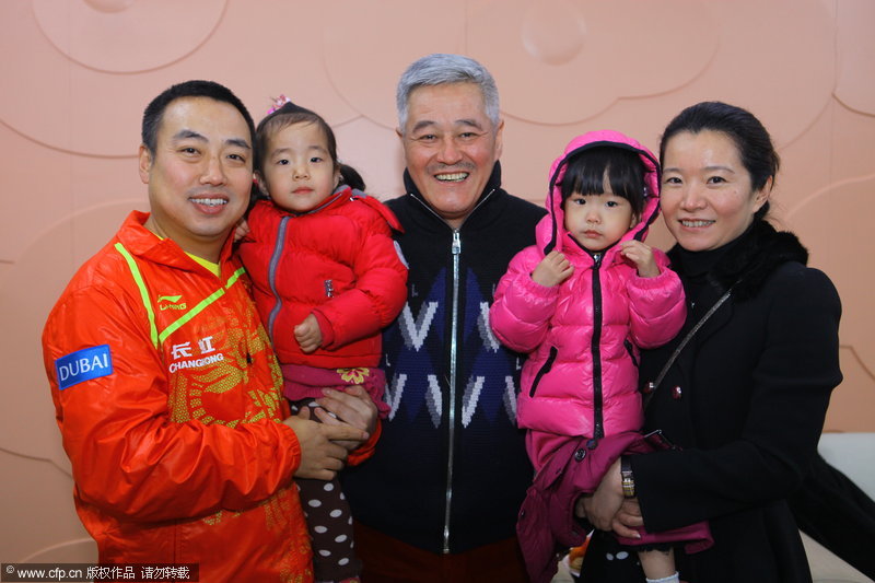 刘国梁携妻子和一对双胞胎女儿与赵本山合影。声明:图片由CFP视觉中国供本网专稿,任何网站、报刊、电视台未经CFP视觉中国许可,不得部分或全部转载,违者必究!