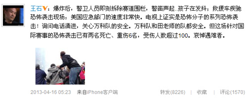 王石发表微博说:“爆炸后,警卫人员即刻拆除赛道围栏,警笛声起..孩子在发抖;救援车疾驰恐怖袭击现场;美国应急部门的速度非常快。电视上证实是恐怖分子的系列恐怖袭击!询问电话涌进,关心万科队的安全。万科队和田老师的队都安全。但这场针对国际赛事的恐怖袭击已有两名死亡、重伤6名,受伤人数超过100。哀悼遇难者。”