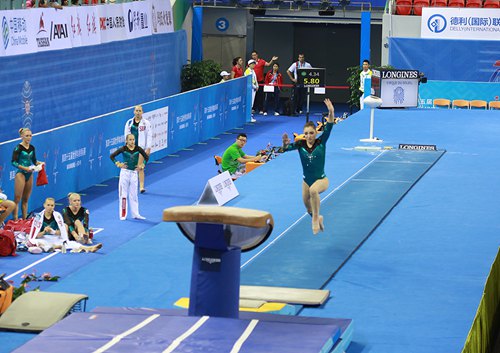 人民网南宁10月5日电(朱晓玲、韦廷彬)10月5日,上届体操世锦赛季军穆斯塔菲娜领衔俄罗斯女子体操队亮相南宁世锦赛。在5日上午的比赛中,穆斯塔菲娜表现不俗,个人总分达到58.874,暂列个人总分首位。其中,双杠、自由体操两项,穆斯塔菲娜的得分居榜首,优势明显。