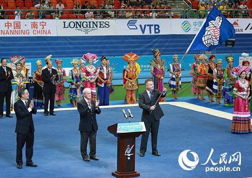 闭幕式上,第四十五届世界体操锦标赛组委会执行主任、南宁市市长周红波与下届世界体操锦标赛举办城市英国格拉斯哥市代表马休·内维尔交接会旗。明年,这项世界顶级的体操盛会将移师英国的格拉斯哥。(完)