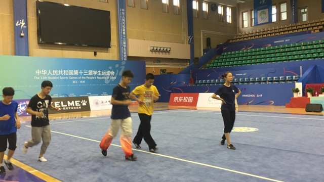 正在浙江中医药大学体育馆内训练的浙江中学组武术队