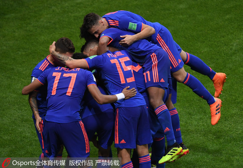 人民网北京6月25日电(杨乔栋 实习生 谷思雨)北京时间6月25日2点,2018年俄罗斯世界杯小组赛一场H组的比赛在索契体育场开赛,哥伦比亚对阵波兰。经过90分钟激战,哥伦比亚以3-0大胜波兰。上半场,J罗助攻米纳头球破门,哥伦比亚1-0领先。下半场,哥伦比亚队的法尔考,夸德拉多分别单刀赴会破门。此役过后哥伦比亚队积3分还有出线的机会,波兰队则成为了首支出局的种子队。(Osports全体育传媒专供人民体育 版权作品 严禁转载)